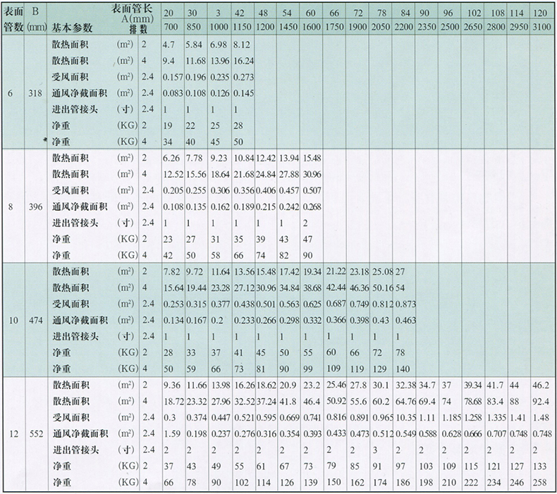 如采用四排,表面管數(shù)為10,管長(zhǎng)為42英寸時(shí),則為GLⅡ-4-10-42。
